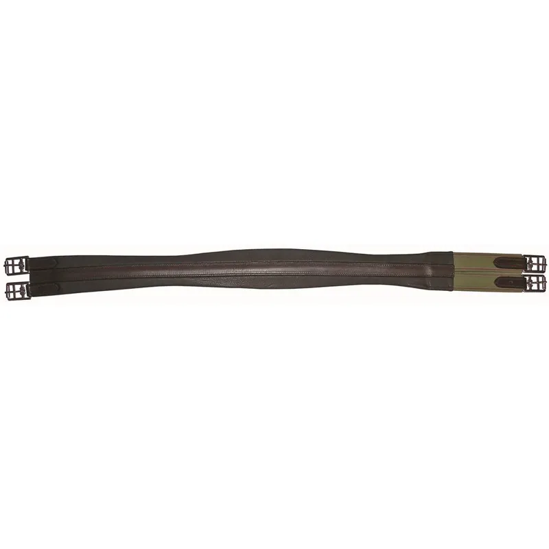 A padded leather girth with stainless steel fittings and elastic at one end.
